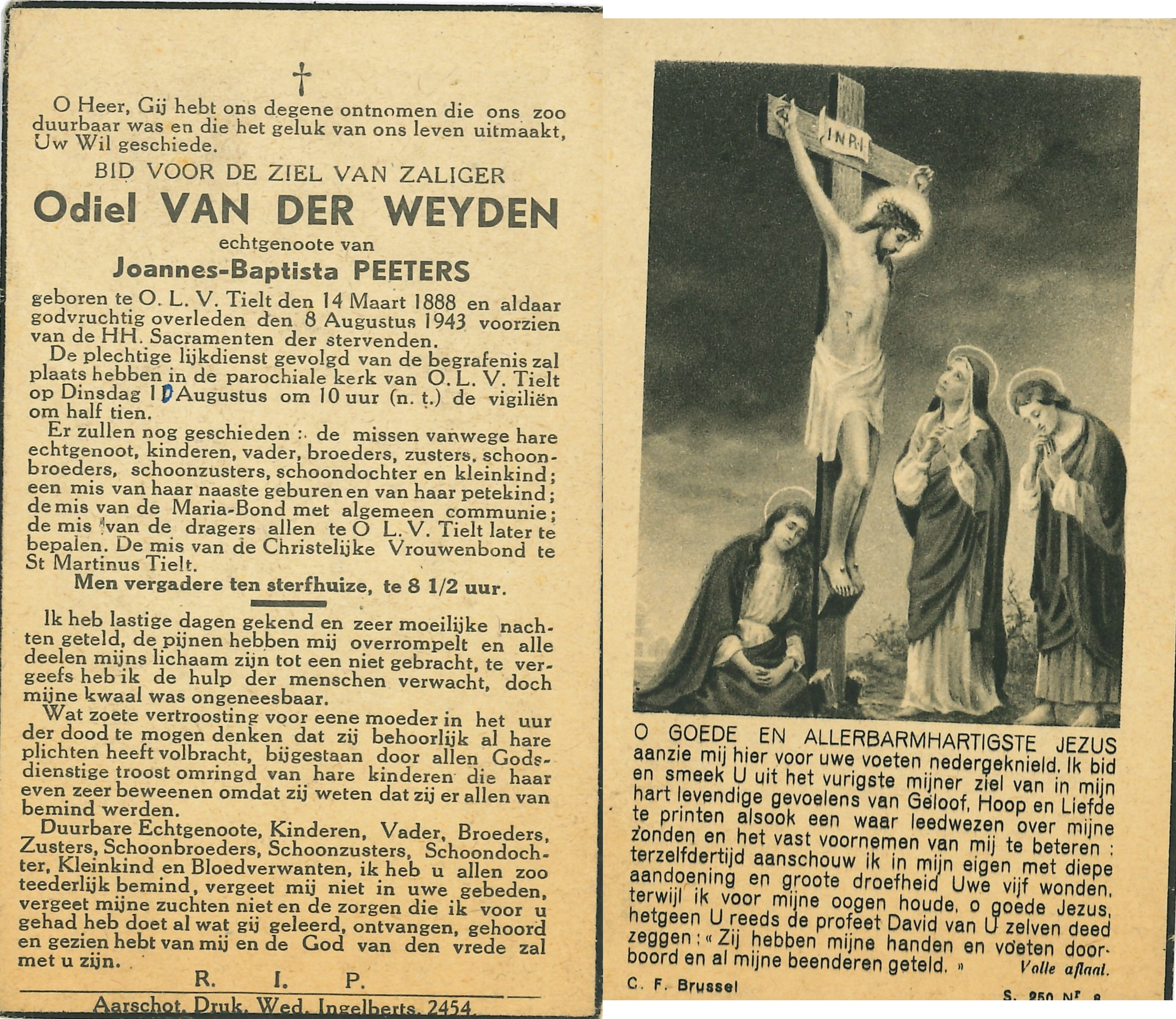 - Beschrijvingdoodsprentje Odiel Van Der Weyden, °OLV Tielt, 14/03/1888 en er + 08/08/1943 echtgenote van Joannes Baptista Peeters