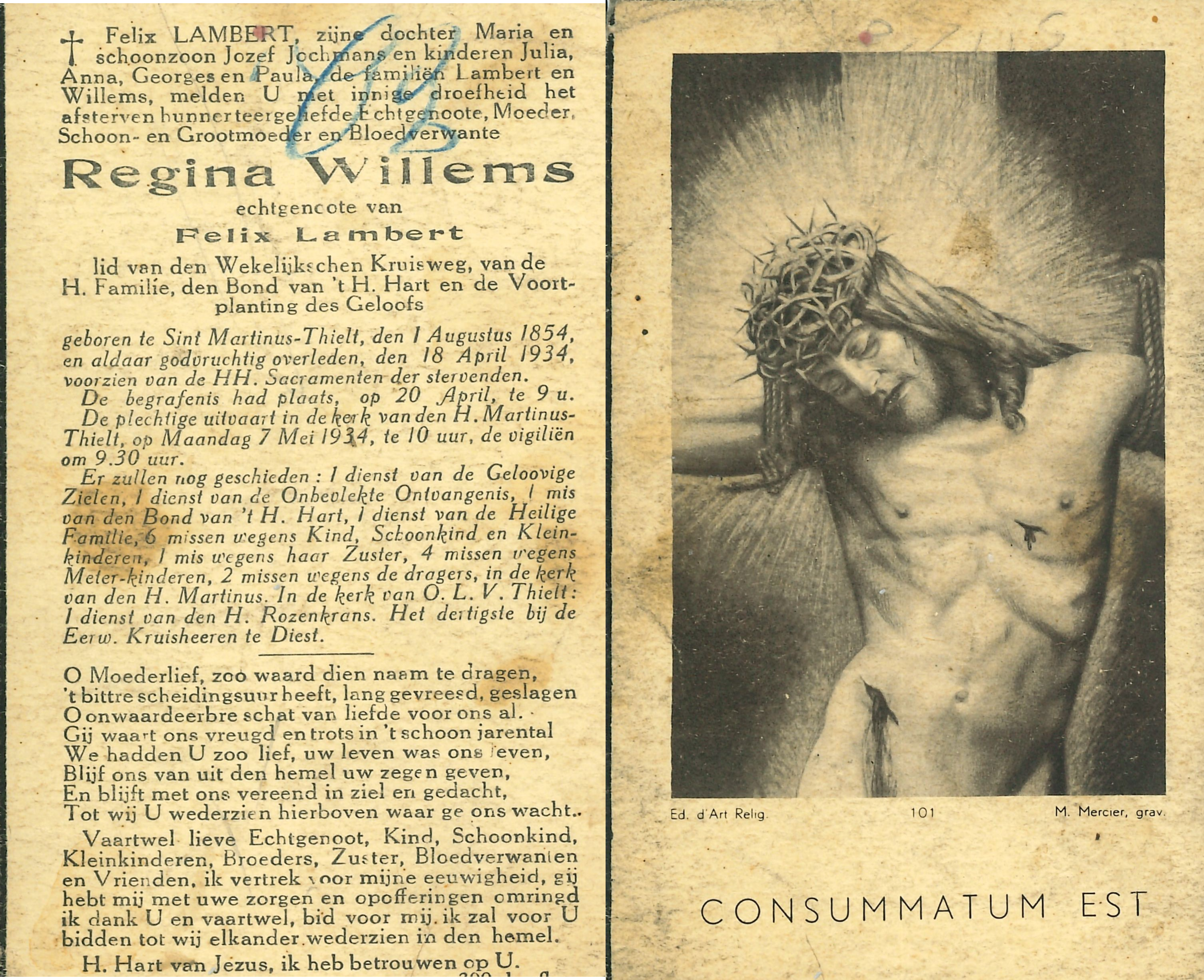 - Beschrijvingdoodsprentje Regina Willems, °Tielt, 01/08/1854 en er +18/04/1934, echtgenote van Felix Lambert