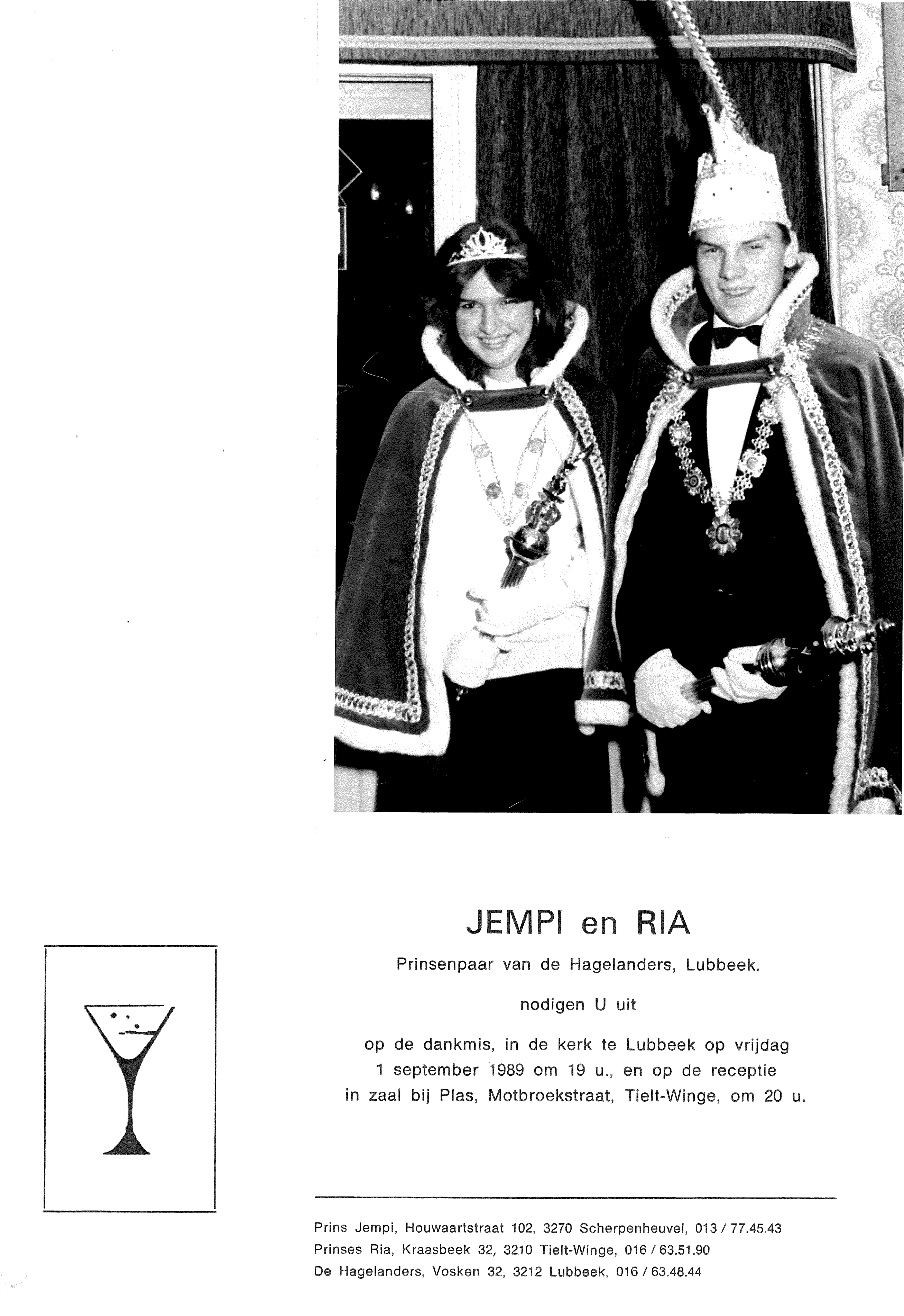 - Beschrijvingfoto Prinsenpaar van de Hagelanders 1989, karnavalsvereniging, voorheen De Gilles van Winge. Prins Jempi van Scherpenheuvel en Prinses Ria van Tielt-Winge geven receptie bij Plas Motbroekstraat Tielt-Winge.