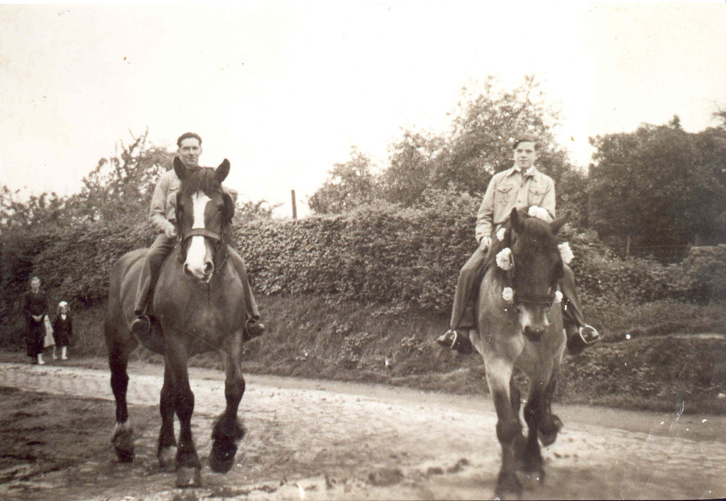 - BeschrijvingProcessie - 15 augustus kermis, personen te paard zijn René Tambeur en Remi Piot