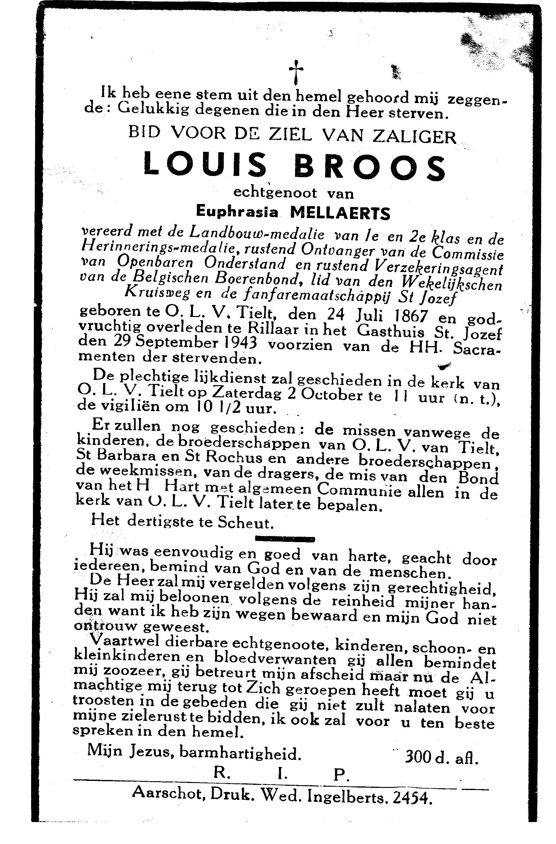 - BeschrijvingDoodspentje van Louis Broos, echtgenoot van Euphrasia Mellaerts. Hij werd vereerd met de lanbouwmedalie van 1ste en 2de klas en de Herinneringsmedalie, rustend Ontvanger van de Commissie van Openbare Onderstand en rustend Verzekeringsagent van de Belgischen Boerenbond, lid van den Wekelijkschen Kruisweg en de fanfaremaatschappij St Jozef. Geboren te O.L.V. Tielt, den 24 juli 1867 en godvruchtig overleden te Rilaar in het Gasthuis St. Jozef den 29 september 1943. Oprichter van de houtzagerij Broos, waarvoor hij op 23 november 1929 een mechanische boomzaag machine aankocht, na eerst manueel gezaagd te hebben in een zaagput.