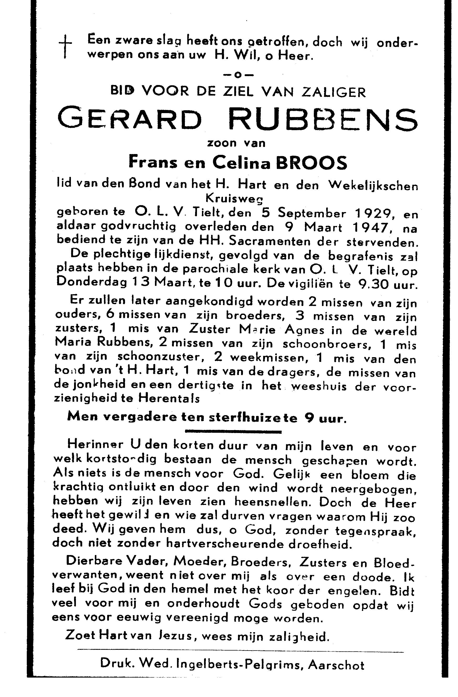 - BeschrijvingDoodsprentje Gerard Rubbens zoon van Frans en Celina Broos lid van den Bond van het H. Hart en den Wekelijkschen Kruisweg geboren te O.L.V. Tielt,den 5 september 1929, en aldaar godvruchtig overleden den 9 Maart 1947