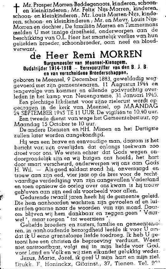 - BeschrijvingDoodsprentje van de Heer Remi Morren (° 9 december 1883 en + 31 januari 1945)