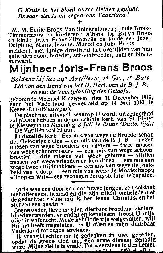 - BeschrijvingDoodsprentje van Joris-Frans Broos (°11/12/1919 te Meensel-Kiezegem ) Gesneuveld op 14 mei 1940 te Kessel-Loo voor het Vaderland.