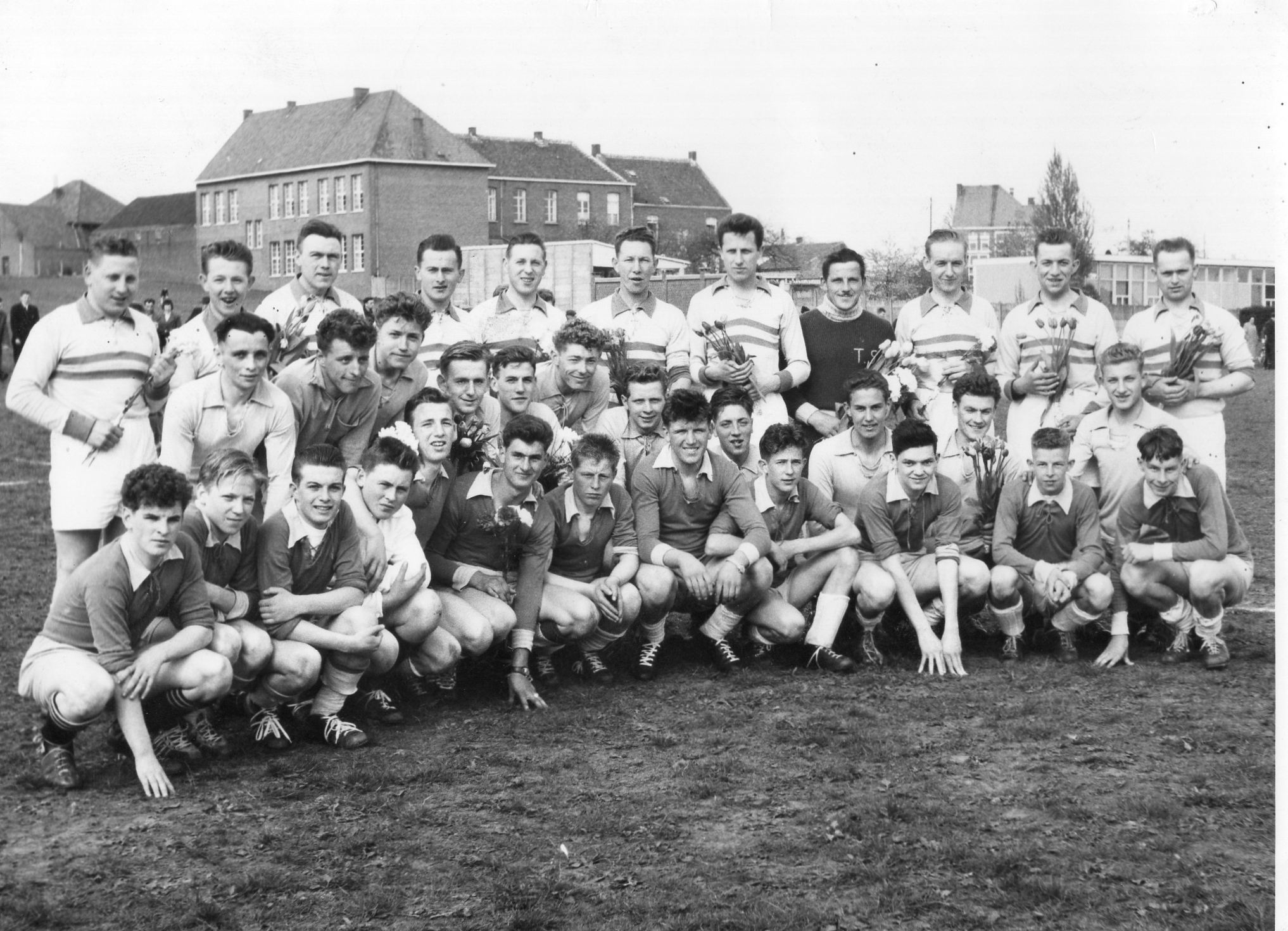 - BeschrijvingDe drie elftallen Tielt Sport, bij de kampioenvieriing van de eerste ploeg , einde seizoen 1959-1960. Dus ook de reserven, en de scholieren vieren mee. Teveel namen ontbreken in de herinnering !