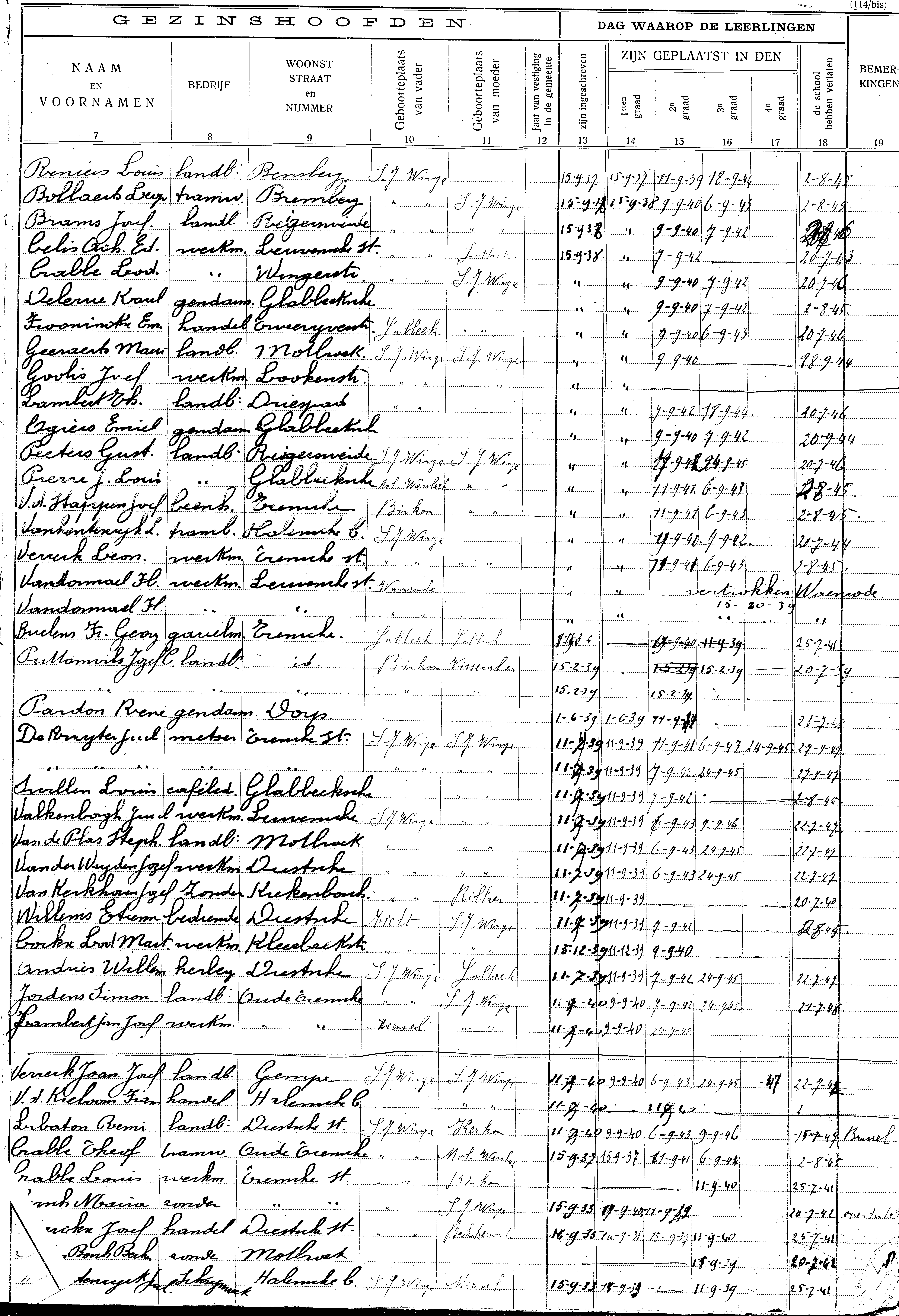 - BeschrijvingLeerlingenregister blad 20: Reniers Jozef L. Constant; Bollaerts Aug. Florent; Brams Martin Jozef; Celis Gaston Juul; Crabbe Andre Theof.; Delerne Daniel Henri; Frooninckx Gust. Emiel; Geeraerts Juul Rene; Goolis Joris Isidoor; Lamber Aug. Jan; Ogiers Joris Cyriel; Peeters Juul Alfons; Pierre Juul Emiel; Van der Stappen Jozef Maurice; Vanhentenrijk Theof. M.; Verreck Gaston Em.; Vandormael Albert Fr. (Omer ?); Vandormael Arth. H; Xav.; Buelens Frans Ferd.; Puttomvils Marcel Frans; Puttomvils Arthur Sidney; Pardon L. Jozef Ant. Marie; De Ruyter Alfons Juul Joris Ferdin.; Swillen Armand Frans; Valkenborgh Frans Alex; Van de Plas Roger; Van der Weyden Joris Const.; Van Kerkhoven Theof.; Willems Jozef Juliaan; Cockx Frans Edward; Andries Juliaan, Jordens Joris Andre; Lambert Andre Aug.; Verreck Gaston Emiel; Verreck Robert Leop.; Van den Kieboom Walter; Liboton Henri Clemant; Crabbe Marcel Frans; Crabbe Jozef; Kirsch Marcel; Merckx Gilbert; Van der Stappen Theof.; Van Hentenrijck Louis