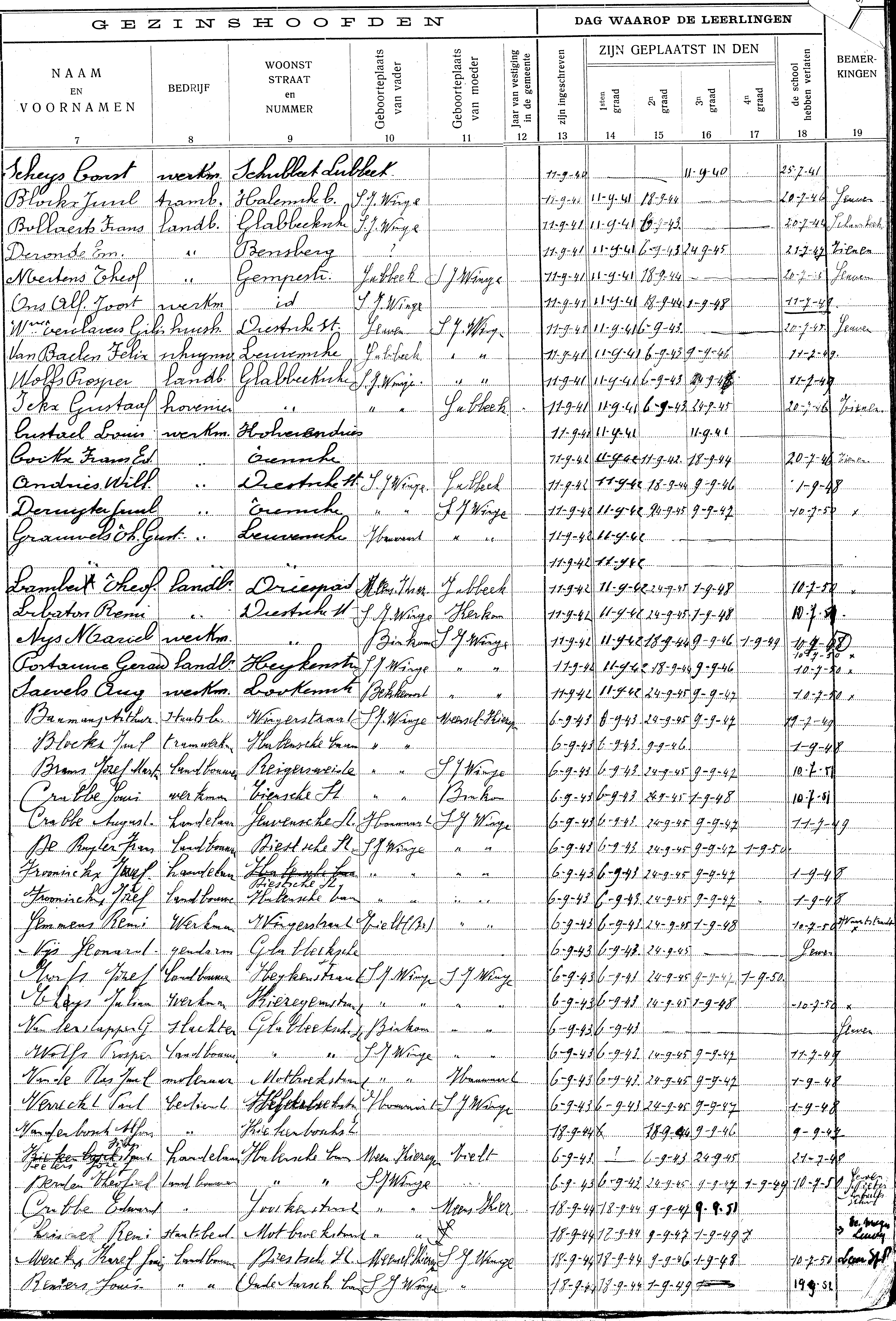 - BeschrijvingLeerlingenregister blad 22: Scheys Frans Hendrik; Blockx Louis Matheus; Bollaerts Remi; Deronde Louis Jozef; Mertens Bertrand; Ons Frans Robert; Terclavers Juul M.; Van Baelen Joris Germaan; Wolfs Marcel Raym.; Ickx Frans; Cristael Juul Lod.; Cockx Rene Karel; Andries Everard Roger; Deruyter Leop. Theof.; Grauwels Ludov.; Grauwels Isidoor; LamberAndre J.; Liboton Jozef M.; Nys Romain; Portauwe Marcel Jozef; Saevels Roger Alfons; Baumans Frans M. H.; Blockx Marcel I.; Brams Robert Isidoor; Crabbe Frans Ghislain; Crabbe Norbert Maurits; De Ruyter Joost M.; Frooninckx R. Louis; Frooninckx R. Josse; Lemmens Boni August; Nijs Alfons Andre; Torfs Leopold; Thys Jozef; Van der Stappen Andre; Wolfs Raymond; Van de Plas Gilbert Alfons; Verreckt Roger Henri; Vandenbosch Marcel; Peeters Willy; Derden Marcel Theofiel; Crabbe Desire Richard; Christael Gaston Fr. M.; Merckx Jozef Edward; Reniers Remi Jozef