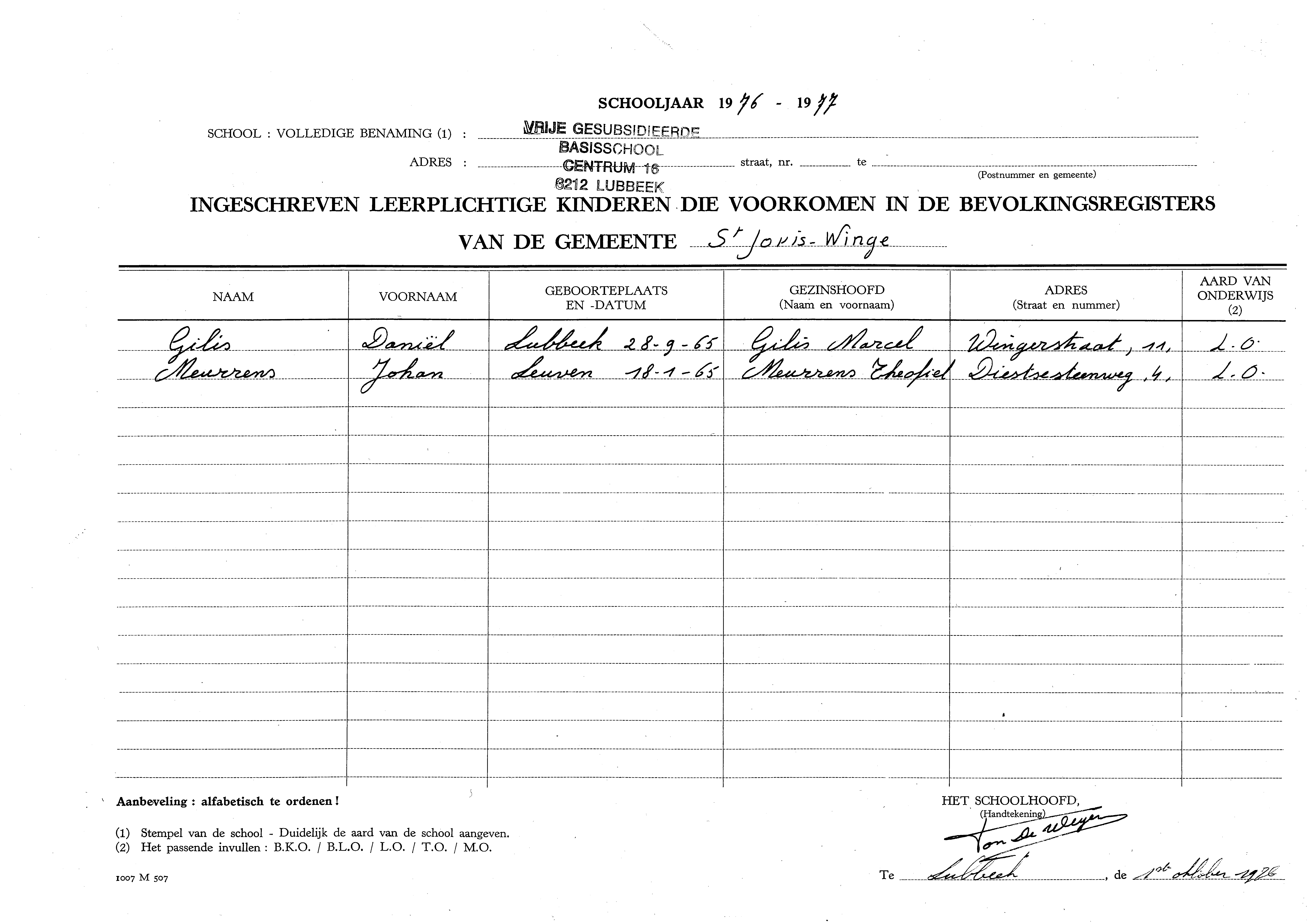 - BeschrijvingLeerlingenregister : bijlage van Vrije gesubsidieerde Basisschool, Centrum 16, 3212 Lubbeek: (schooljaar 1976 - 1977) 01 Gilis Daniël; 02 Meurrens Johan